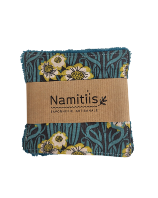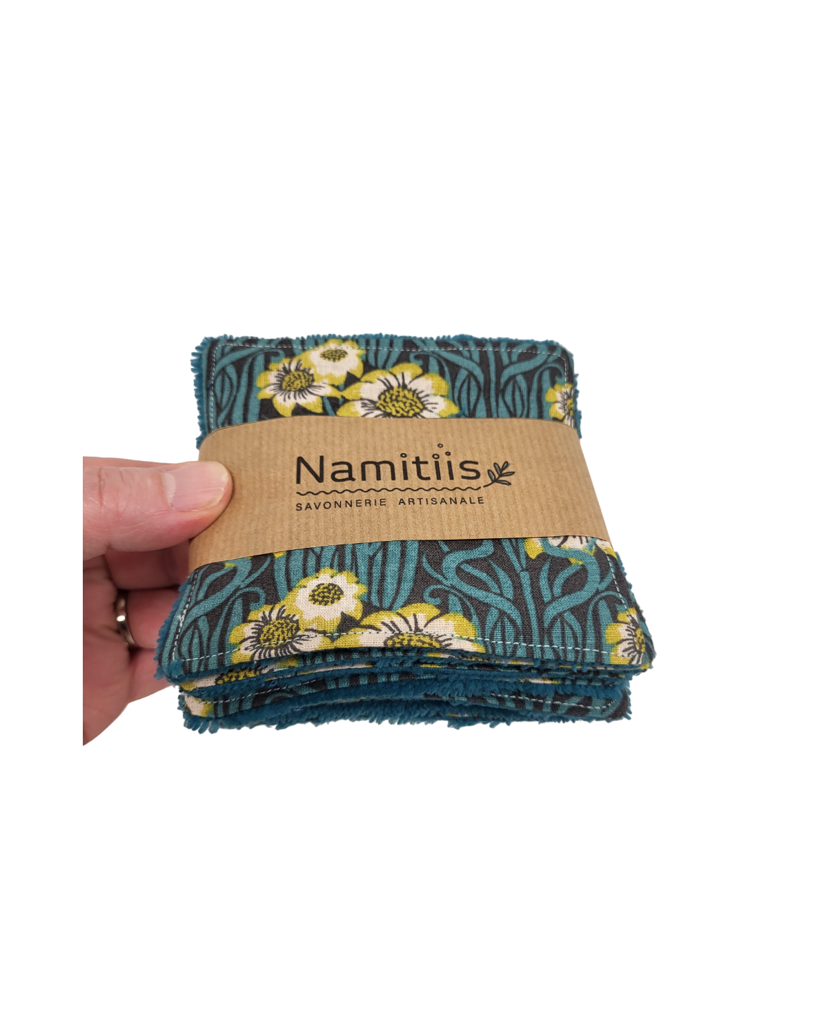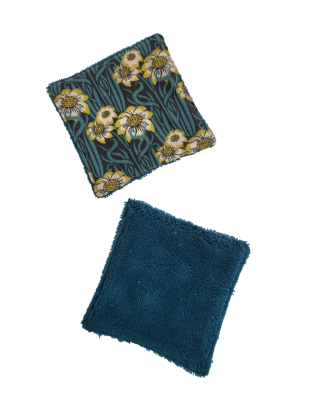Lot de 7 grandes lingettes motif fleurs sur fond gris avec microfibre bambou bleu/vert.