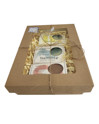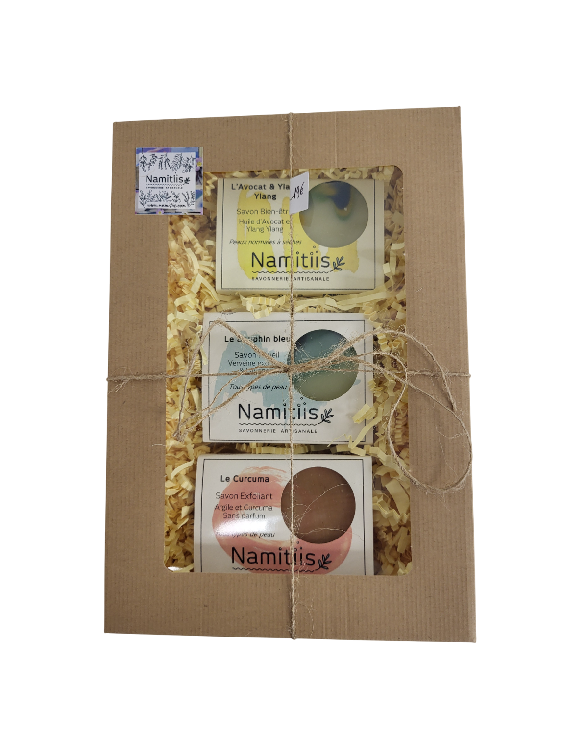 Coffret kraft à fenêtre comprenant un savon Avocat, un savon Dauphin bleu et un savon Curcuma.