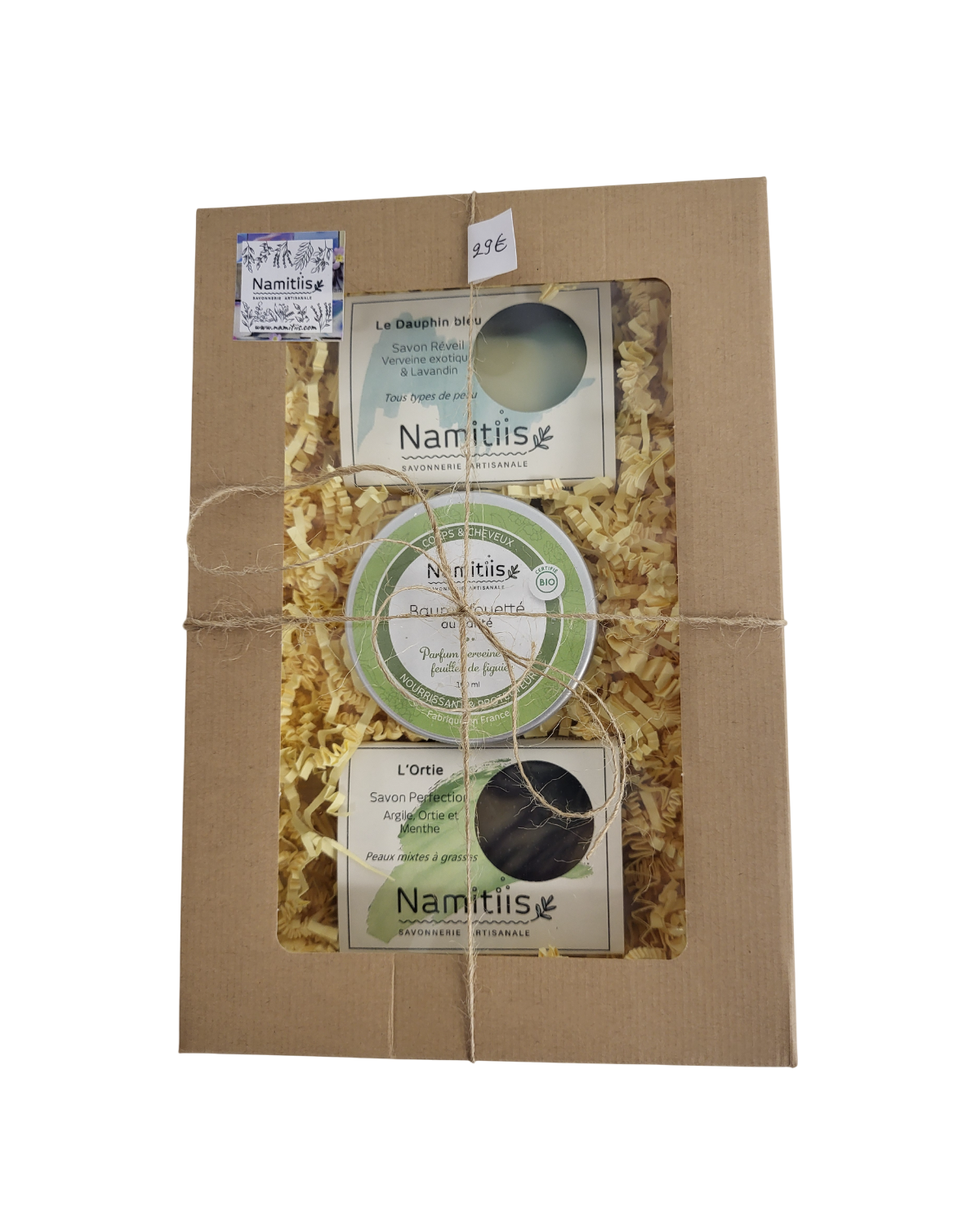 Coffret kraft à fenêtre comprenant 1 baume fouetté karité parfum verveine feuilles de figuier + 1 savon Ortie + 1 savon Dauphin Bleu