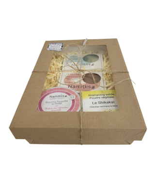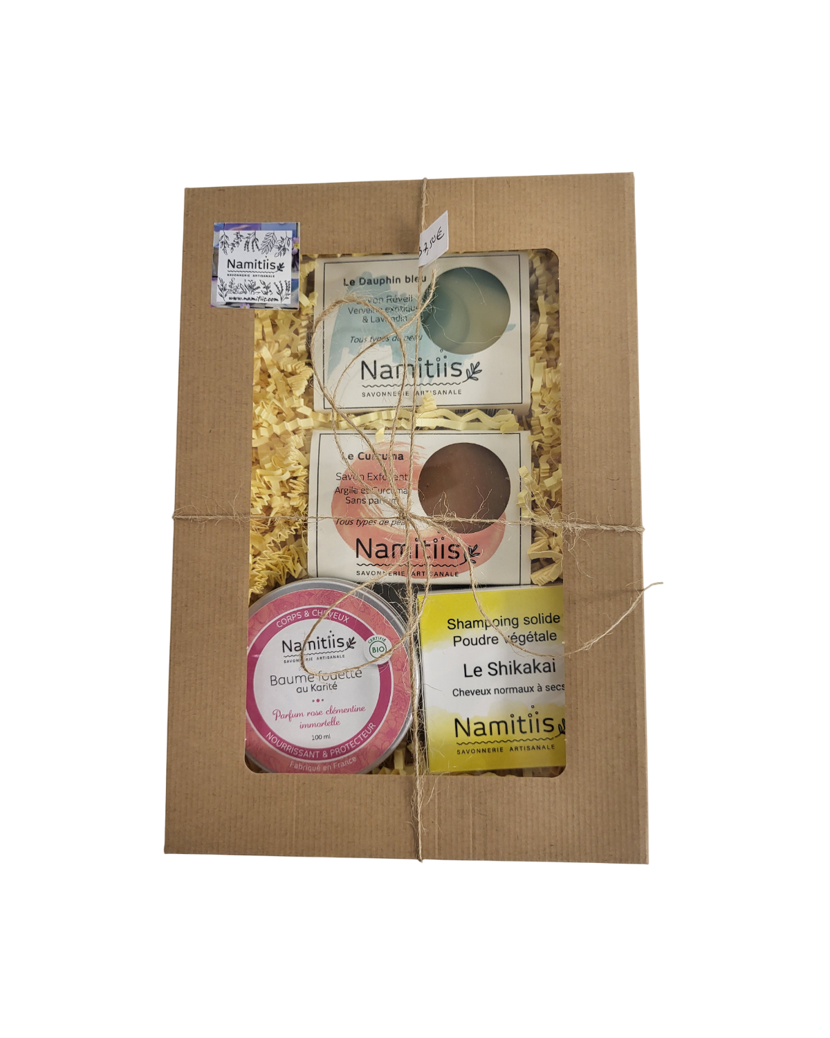 Coffret kraft à fenêtre comprenant baume fouetté karité parfum rose clémentine immortelle + 1 savon Dauphin bleu + 1 savon Curcuma + 1 shampoing solide Shikakai.