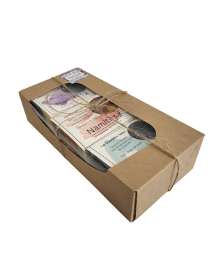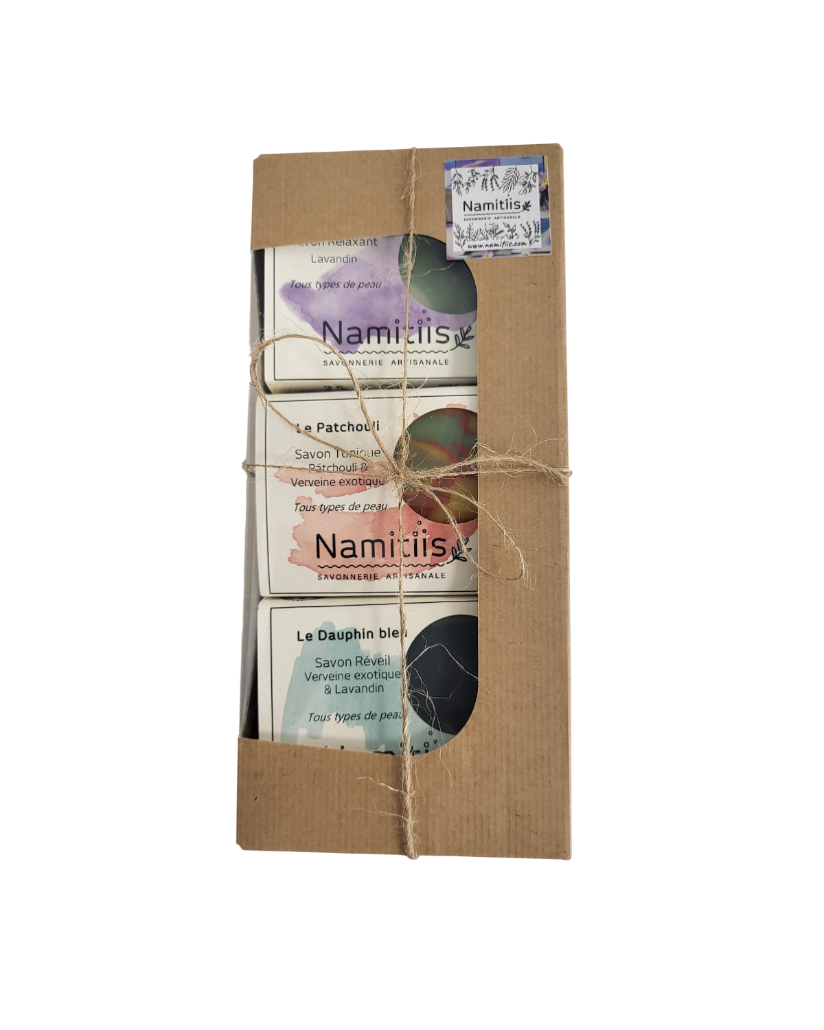Coffret kraft à fenêtre comprenant 1 savon Patchouli + 1savon Dauphin bleu + 1 savon Lavandin