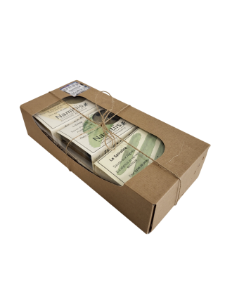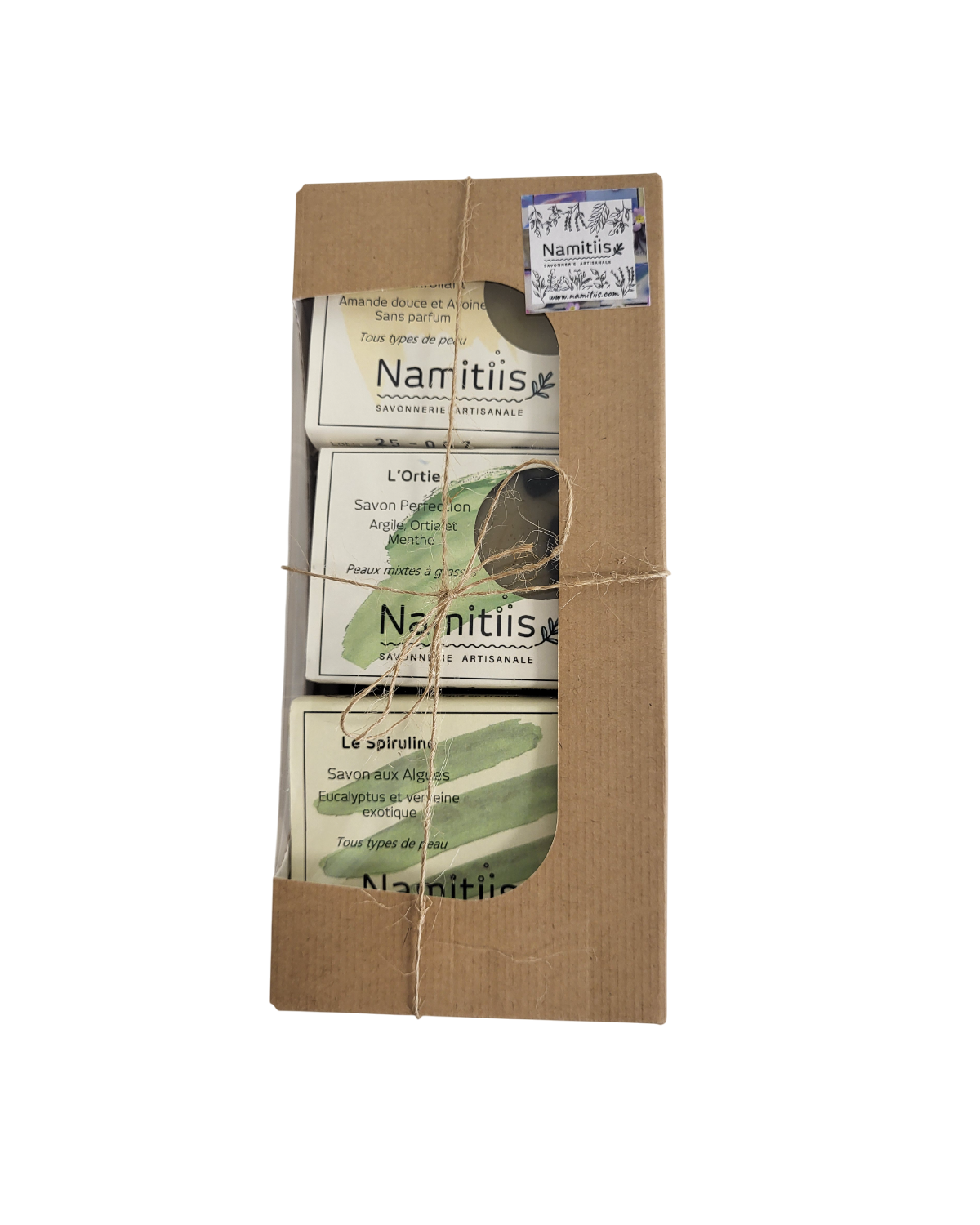 Coffret kraft à fenêtre comprenant 1 savon Ortie+ 1savon Spiruline + 1 savon Amande et Avoine